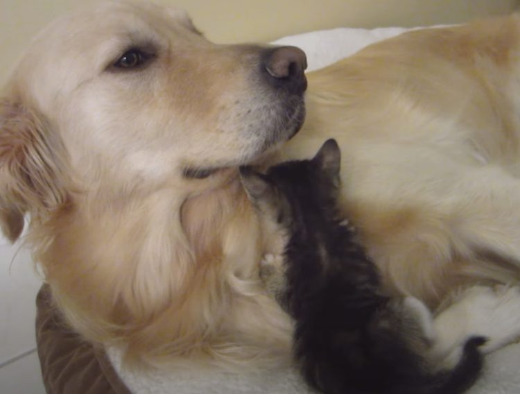 ほっこりするなぁ♪ 子猫になつかれているゴールデンレトリバー。