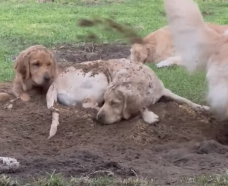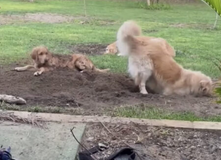 頑張って土を掘るほど…後ろにいる犬が埋まっちゃう(笑)