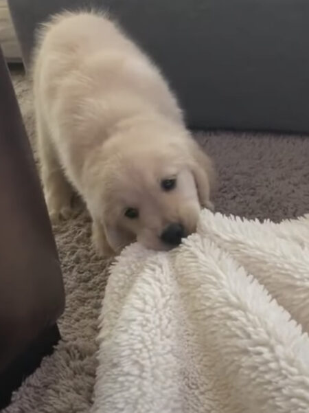今日はこれでお昼寝するのっ! どうしても毛布が欲しい子犬が可愛いー!