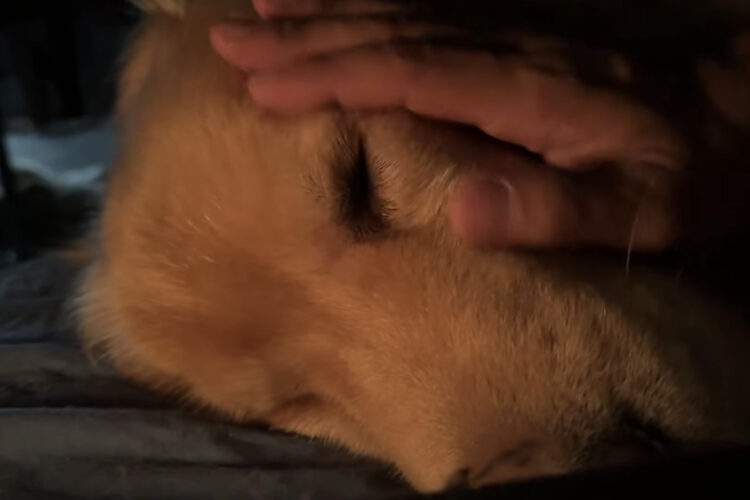 飼い主さんにナデナデされながら