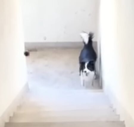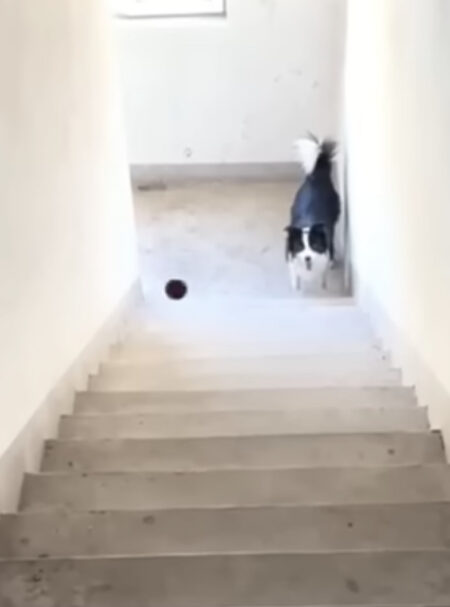 犬さんは階段下で待ち構えて、それを上手にキャッチ♪