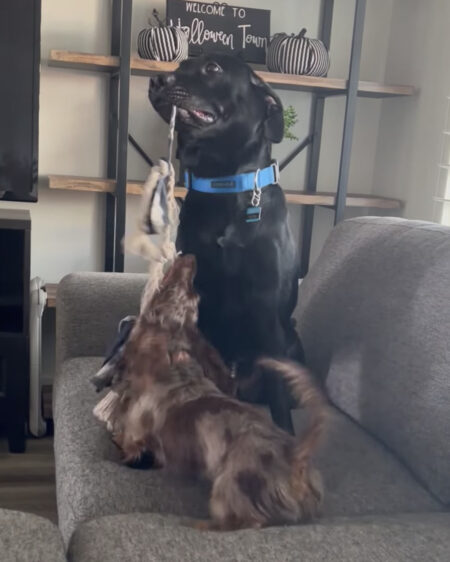 犬さん同士の綱引き勝負! 想像していなかった結果になったぞ。