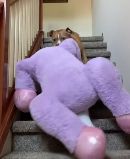 人間と同じくらいの大きさ! ビッグサイズのぬいぐるみを、2階に連れていきたくて頑張る犬さん。