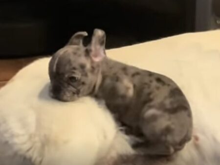 こっそり登ろうしているフレンチブルドックの子犬さん。