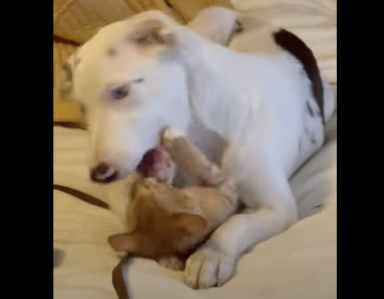 仲良く遊んでいる犬さんと子猫さん。