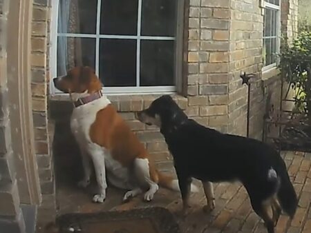 お外で遊んできた3匹の犬さん、玄関ベルを押して元気よく「ただいまー!」