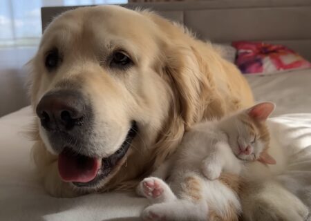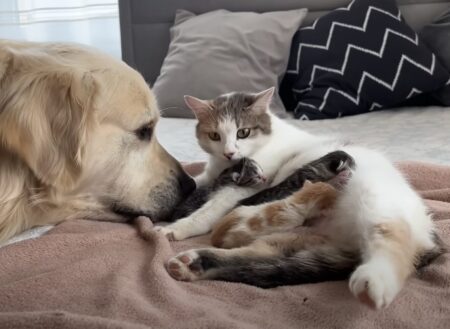 子猫の誕生を大喜びしている犬さん。すぐに子猫たちと親友に!