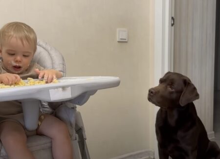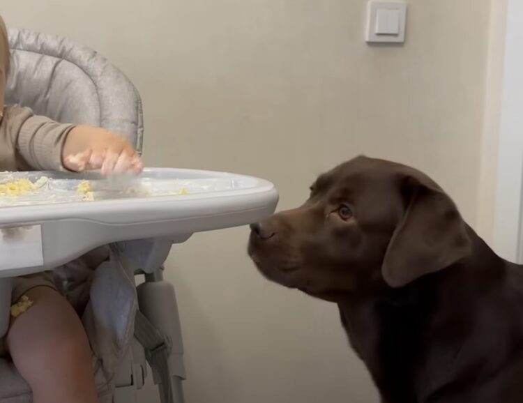 犬「残すなら食べてあげるよ?」赤ちゃんのおやつタイムを見守り!
