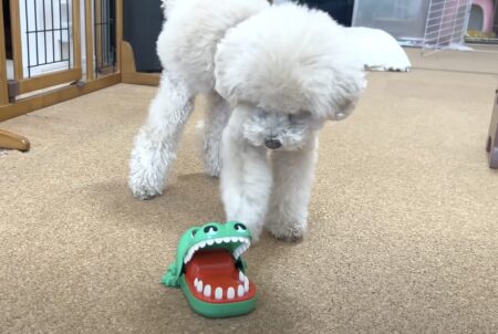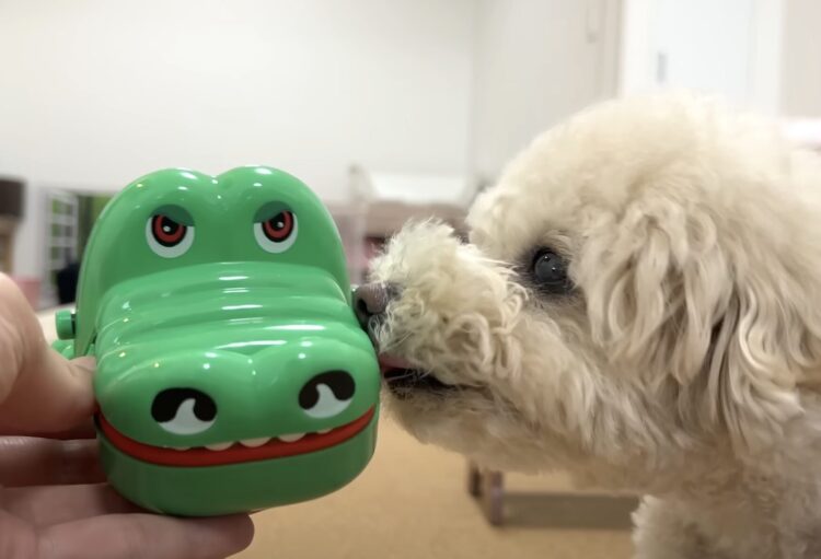はじめてワニのおもちゃで遊ぶ犬さんの反応が可愛すぎた♡