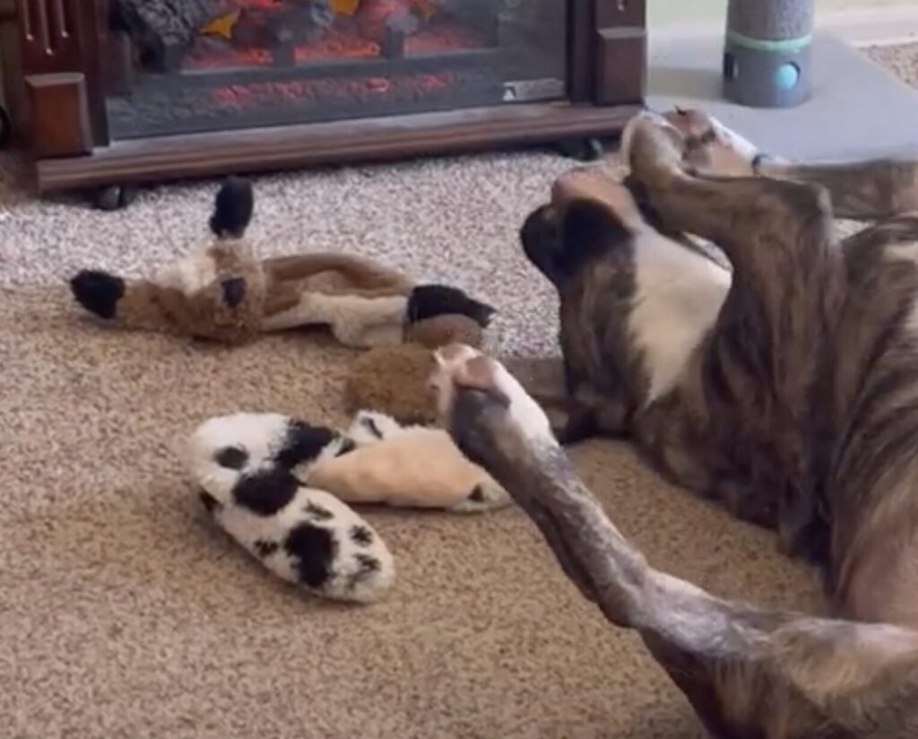 暖炉の前でゴロゴロするのが 大好きだというこちらの犬さん。 ごろごろタイムには お気に入りのおもちゃも一緒! 自分でおもちゃをたくさん集めていました♪ 大好きな場所で、大好きなものに囲まれて とっても楽しそうな犬さん♪ これ以上ないリラックスっぷ... -