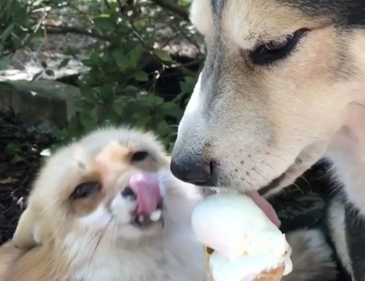 アイスを分け合うほど仲良し!一緒に暮らす犬とキツネ。