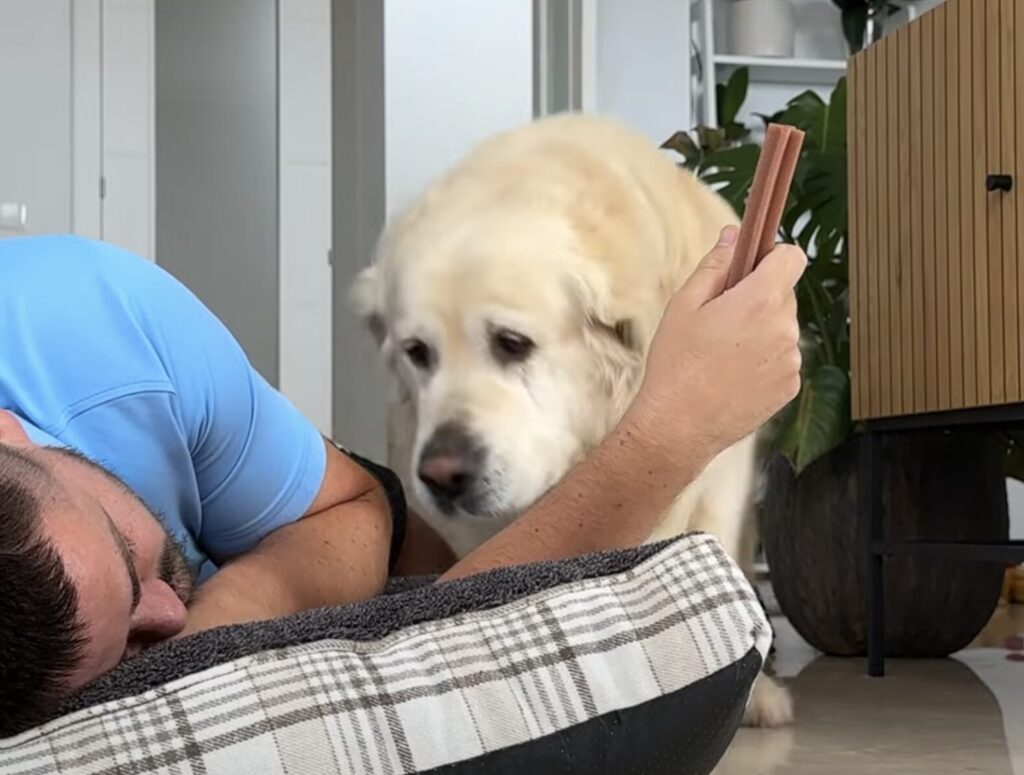 起きて! 一緒に寝る? 寝ている飼い主を見つけた大型犬の反応が可愛らしい♡