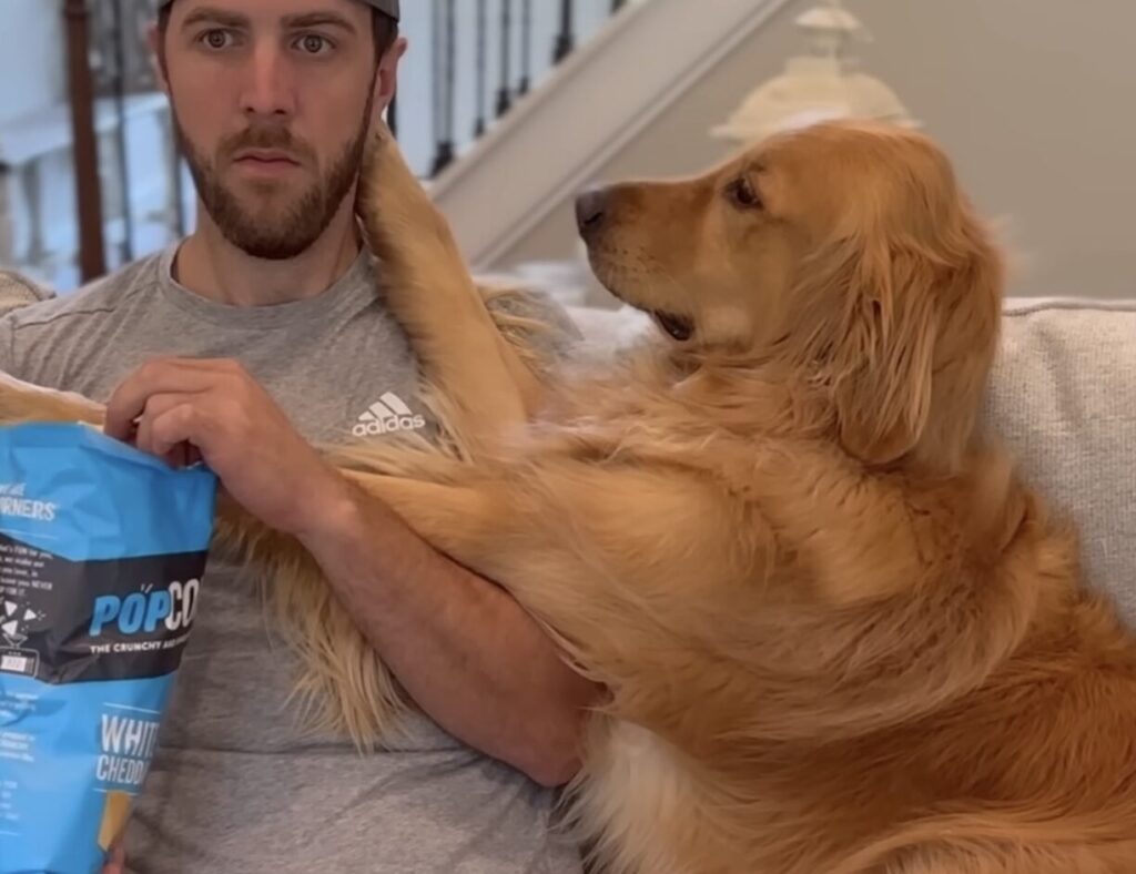 愛犬のゴールデンレトリバーさんが 床でスヤスヤ寝ている隙に こっそりおやつを食べようとしている飼い主さん。 おねだりされたら困っちゃうので 寝ている今のうちに♪ ところが、匂いで気づいたのか 音でバレちゃったのか、 次の瞬間には犬さんが隣に! 反... -