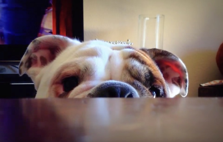 机からそ〜っと顔を覗かせるブルドッグ。様子をみると…