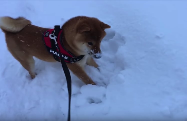 雪がお鼻についちゃった!楽しそうにはしゃぐ柴犬。