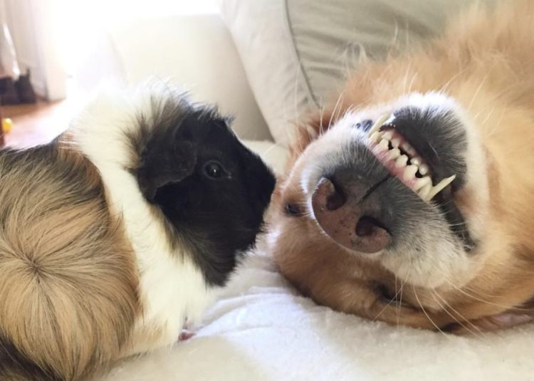 ゴールデンレトリバーのお友達は、何倍も小さいモルモット!
