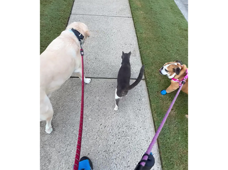 犬さんたちの散歩に、毎日飛び入り参加する猫。仲良く並んでお散歩だ!