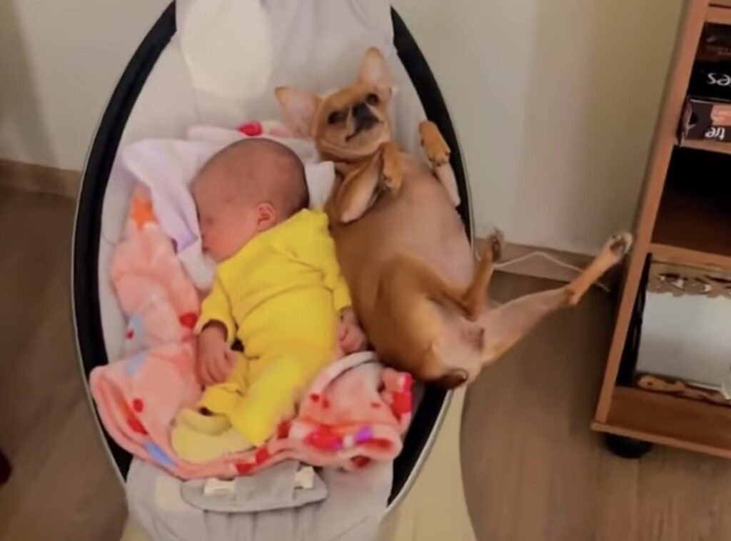 ギリギリ乗れた♪ 寝ている赤ちゃんの隣に割り込むワンコ。