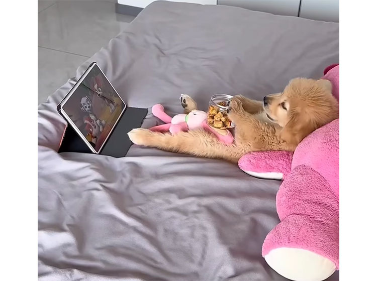 タブレットで動画を眺めながら、 もぐもぐおやつを食べている子犬さん。 大好きなおやつと、楽しい動画、 お気に入りのぬいぐるみも、 好きなものを全部揃えて 自分だけの時間を楽しんでいますね。 ポロポロと食べカスをこぼしても まーったく気にしていな... -