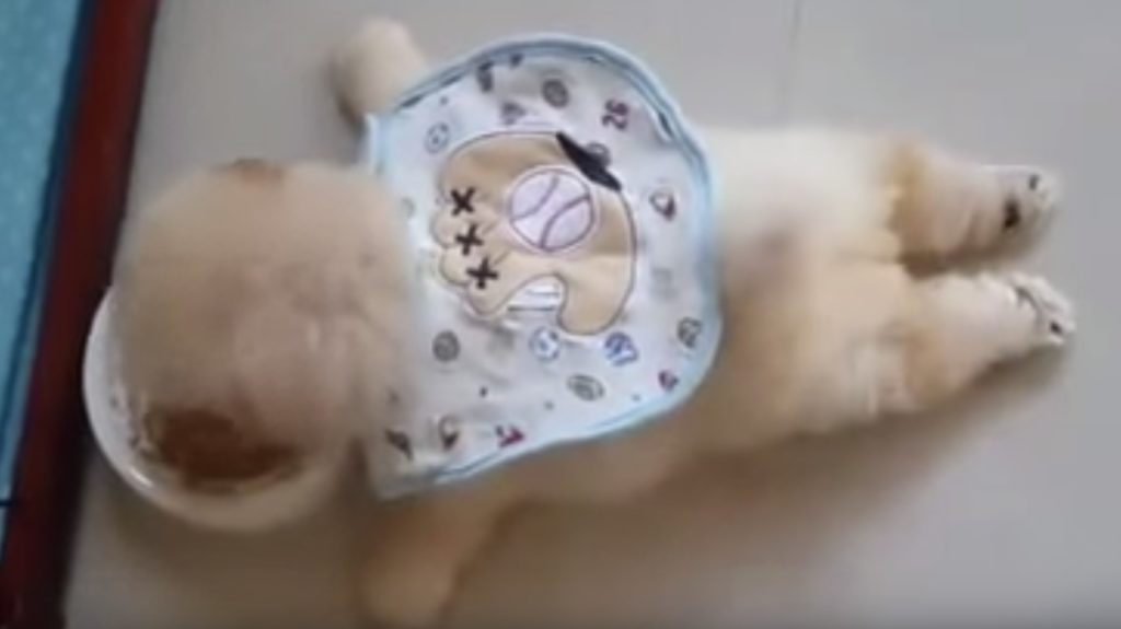 最高に可愛い!大の字でゴハンを食べるモフモフ子犬。