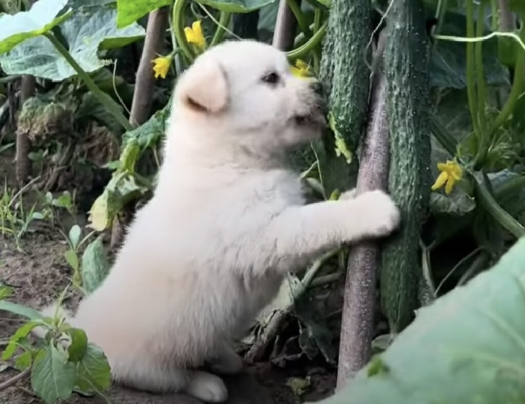 きゅうり畑に喜ぶ子犬♪ 夏休みに田舎にやってきた子どもみたい(笑)