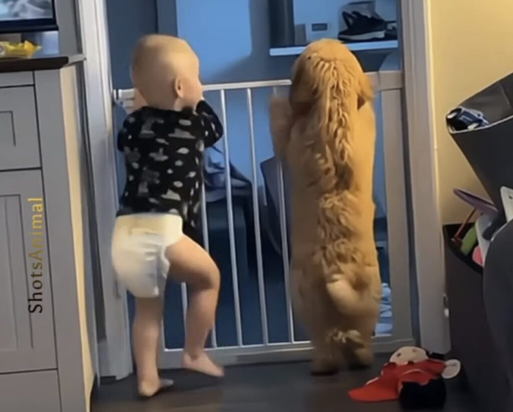 ベビーゲートの向こう側を のぞきこんでいる犬さんと、 その隣にはお友達の赤ちゃんが。 フリフリしている犬さんを見て 赤ちゃんは真似をするようにおしりをフリフリ♪ ぴょんぴょん飛び跳ねている 赤ちゃんの真似をして、 犬さんも一緒にピョンピョンとジ... -