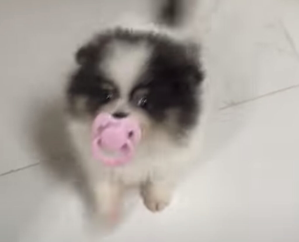 子犬「返したくナイ」赤ちゃんからおしゃぶりを奪って逃走!
