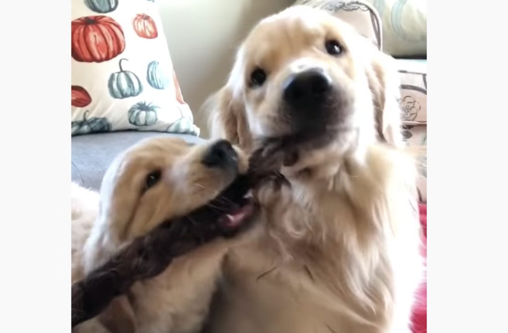 2匹で楽しく引っ張り合い♪ でもよく見ると、それロープじゃないよ!