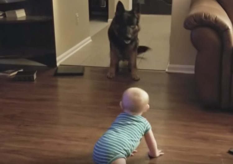 赤ちゃんとジャーマンシェパードの可愛すぎる鬼ごっこにキュン!