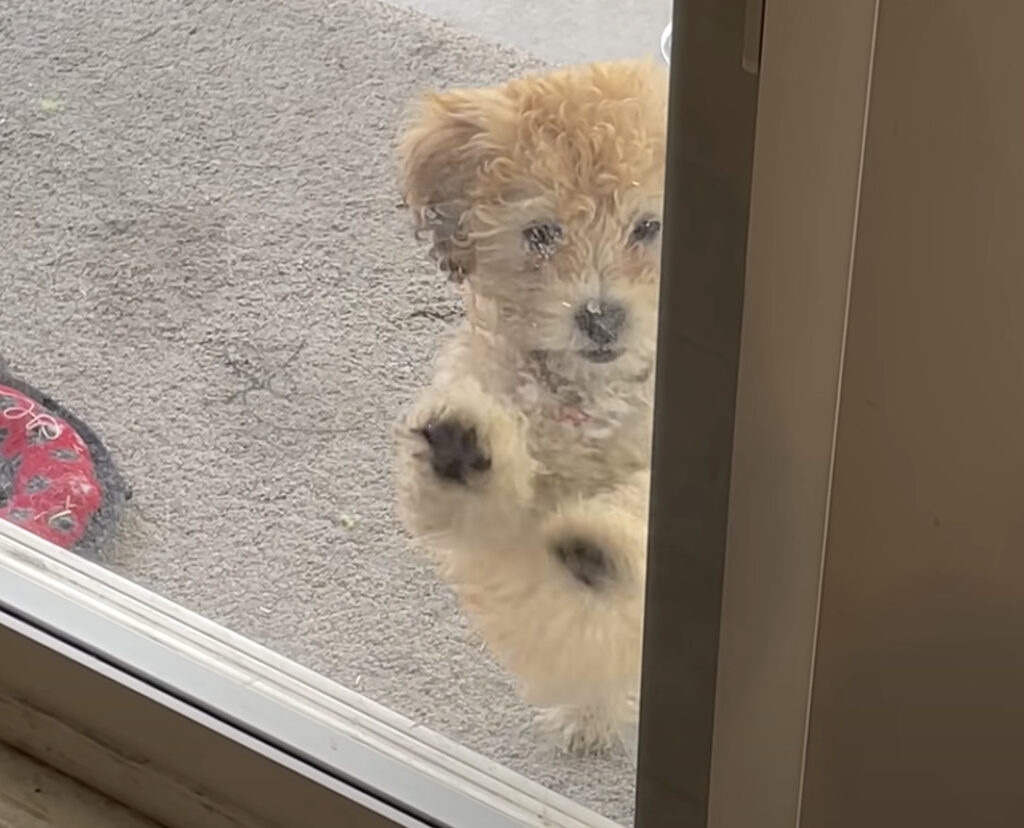 ぬいぐるみのようにモフモフな まだ小さな子犬さん。 お庭で遊び終わった後に お家に入ろうとしたら... ガラスのドアが閉まってて入れない!! このお家にはペットドアが用意されていて、 子犬さんにも教えているのですが まだ覚えることができずに 「締め出...