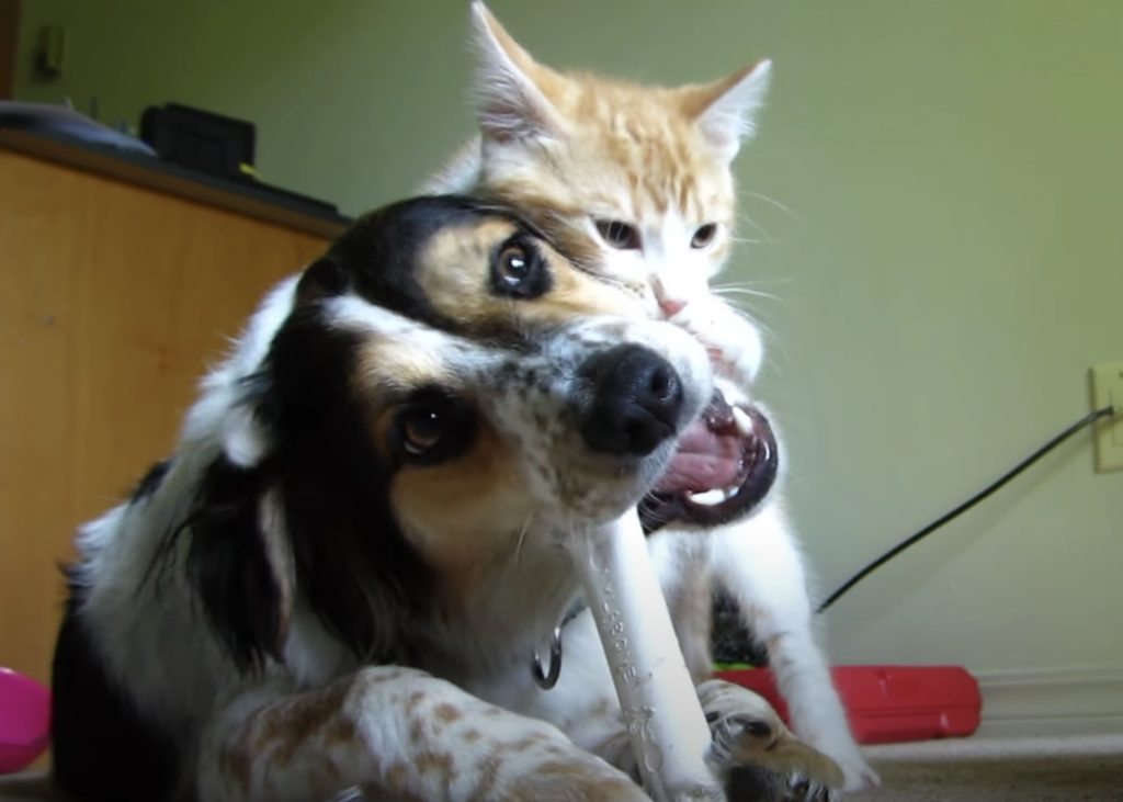 犬「今、おやつタイムだから!」子猫にからまれても骨を諦めないワンコ。
