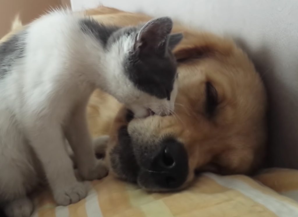 一緒に暮らしている犬さんと子猫。 子猫がもっと小さい時から、 面倒を見てあげているので子猫にとって 犬さんは親代わりでもあり、一番の親友。 猫ほどではないですが、犬さんもお昼寝が好きなので ベッドでウトウト。お昼寝タイムに入りますが... 遊びた... -