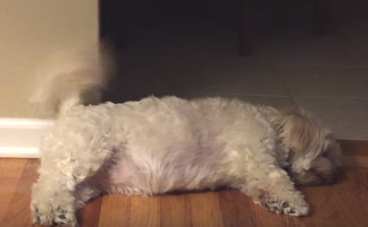 床でごろんとおやすみ中のシーズー。 ぐっすり眠っているのかと思いきや、おやおや、? なぜか、終始ノリノリなわんちゃんでした。