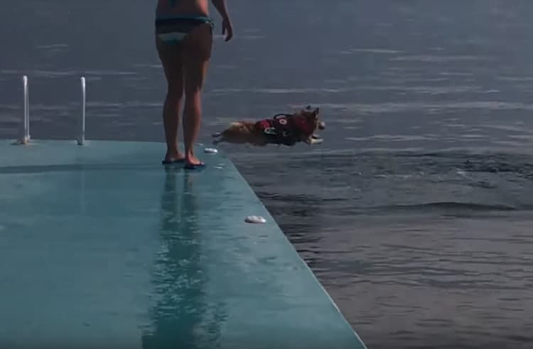 コーギー犬、勇気を出して初めてのダイブ!が、結果は…