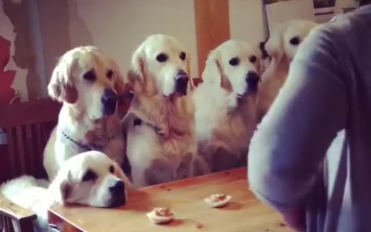 ずらりと並ぶゴールデンレトリーバーさんたち いまから待望のおやつタイムです。 端から順番に一匹ずつ、お利口に順番待ち。 これならゆっくり落ち着いて食べられるね! とっても賢いワンコさんたちなのでした。