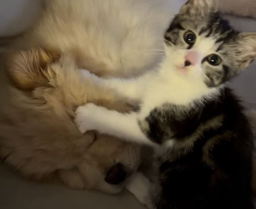 あれ〜? 子犬と子猫はどこに? 帰宅した飼い主さんが お家の中を探してみると 電気が付いていないお部屋で、 子犬さんと子猫を発見!! ふたりで遊んでいた...わけじゃなくて 子犬さんが寝ている横で 子猫さんがなにやらモゾモゾ。 飼い主さんと目が合う... -