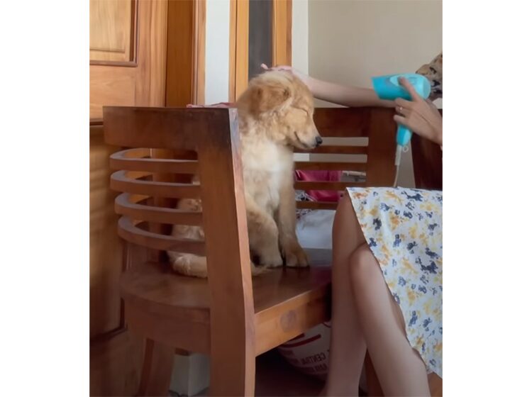 お風呂に入った後に なぜだか急に眠くなることってありますよね。 こちらの子犬さんは 飼い主さんとのシャワータイムを終えて これから体を乾かしてもらうところ! 椅子でおとなしく ドライヤーを待っていたのですが どうやらもう眠気の限界! 優しく撫で... -
