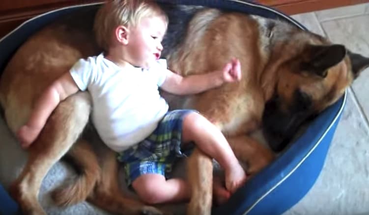 「あの、ちょっと眠らせて…」子守を頑張るシェパード犬。