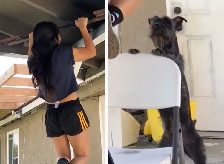ガレージに鉄の棒を設置して トレーニングをしている女性。 踏み台にしていた椅子から離れ、 これから懸垂をしようとしているのですが... それを近くで見ていた愛犬が、 犬「あれ?ご主人降りられないの?」と 心配そうに見つめています。 わざと椅子に足... -