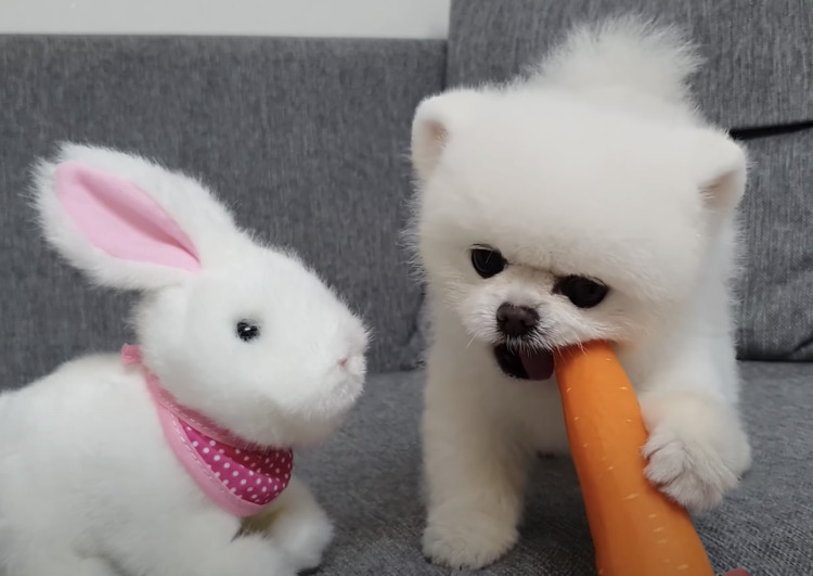「ボクにもちょうだいよ!」ウサギから食べ物を横取りするポメラニアン