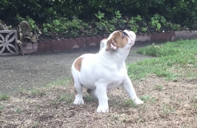 顔近っ! にらめっこ対決するブルドッグさん。