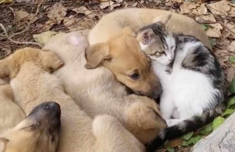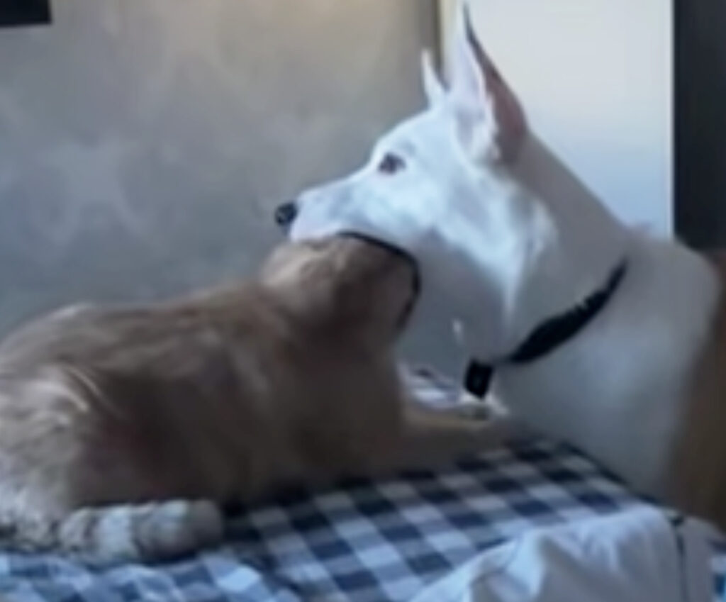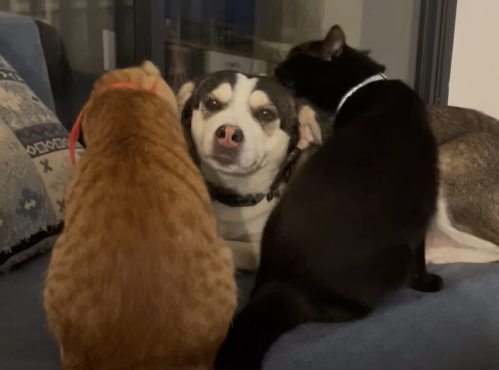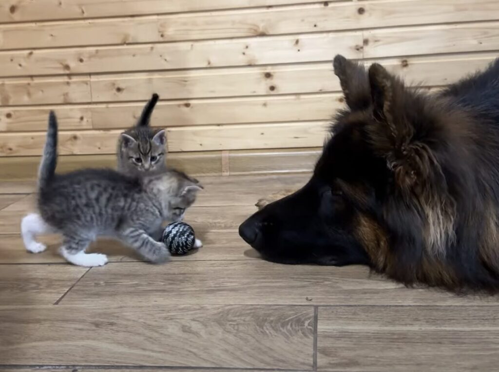 遊ぶ子猫たちを見てほっこりな犬さん、でもよく見るとそのおもちゃは…