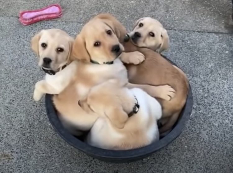 1匹が入ると、みんなマネしたくなる?バケツにギュウギュウになる子犬。