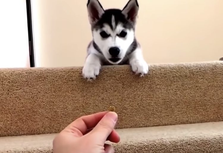 「怖いけど、おやつは欲しい…」ご褒美に釣られて階段に挑戦する子犬