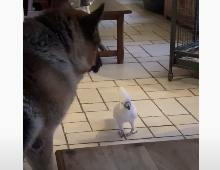 犬さんと真っ白なタイハクオウム。