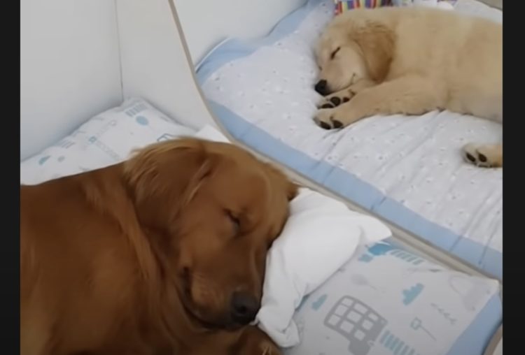 仲良くスヤスヤ♪ 専用ベッドで眠るゴールデン親子。