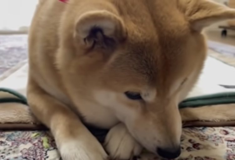 「野菜?おいしかったよ?」食べたフリして隠す柴犬。
