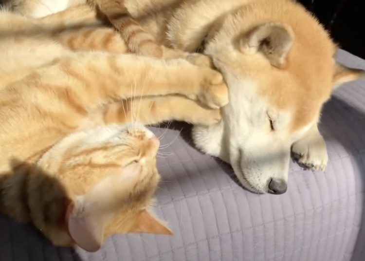 もみもみっ。猫の顔マッサージを受けながら眠る犬。