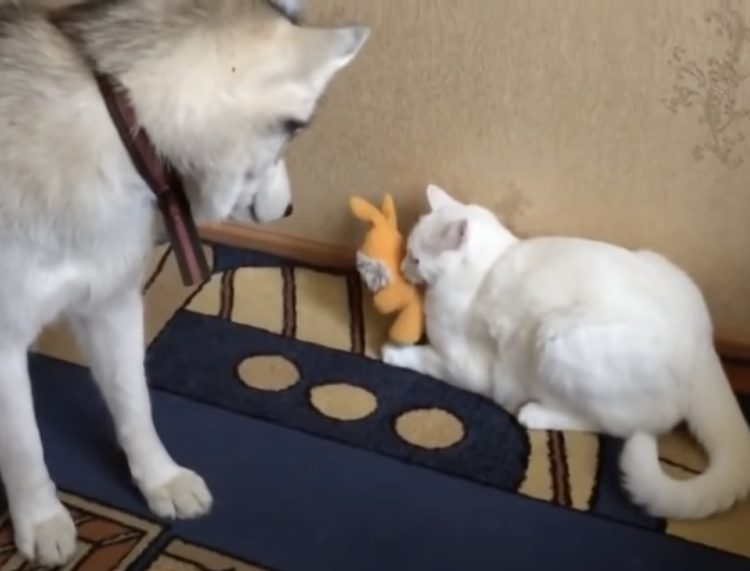 うさぎのぬいぐるみで遊んでいる白猫さん。