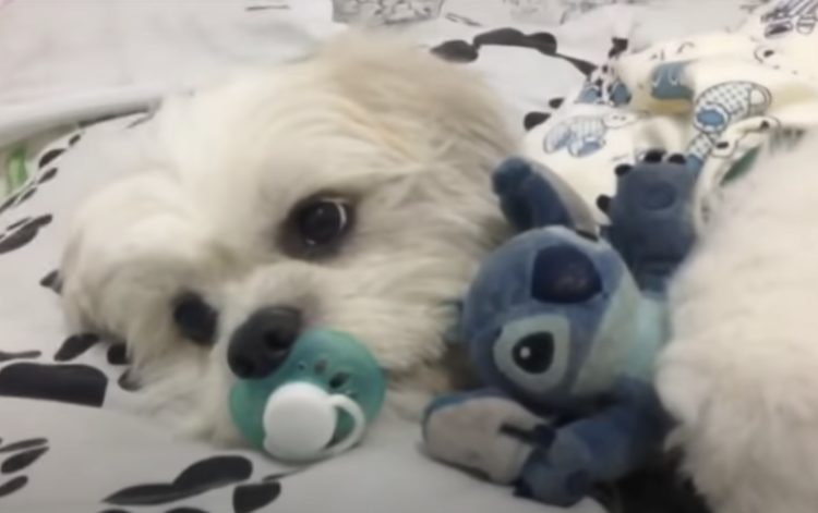 おしゃぶりをくわえる犬さん。